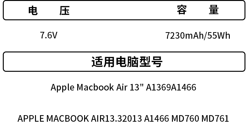 适用苹果Macbook Air 13.3 i7 MD760 MD761 A1466 A1496 A1369 A1405 A1377 笔记本电池